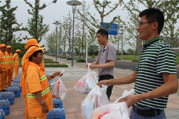 朱亞楠表示,園區(qū)環(huán)衛(wèi)工人頂著烈日,為恒大集團(tuán)等園區(qū)企業(yè)創(chuàng)造了整潔、優(yōu)美的城市環(huán)境,他代表恒大集團(tuán)宿遷項(xiàng)目全體人員向他們致以誠摯的敬意和謝意。許紹杰也對(duì)奮戰(zhàn)在一線的環(huán)衛(wèi)工人表示感謝和祝福,多次叮囑他們高溫作業(yè)要注意安全,勞逸結(jié)合。